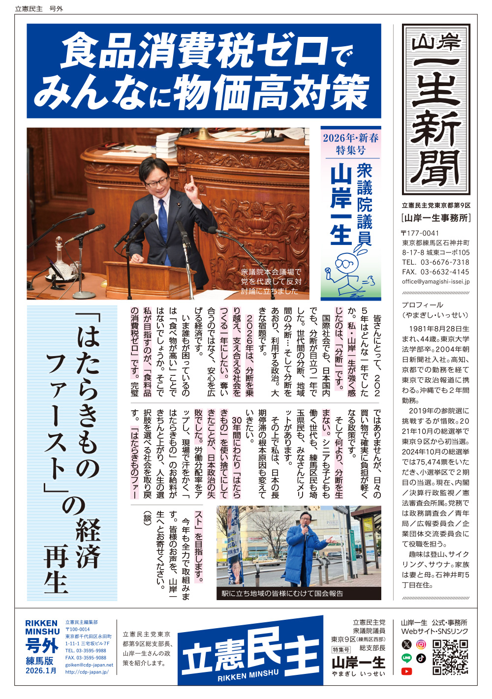 まっとうな政治へ、今こそ変えたい コロナ復興へ現場にこそ、答えがある 消費税5%に緊急時限減税と、あなたの暮らしを守ります。 すべての子どもたちに保育・教育の機会を保障します。大学等の授業料を半額に。 住まいは権利。経済